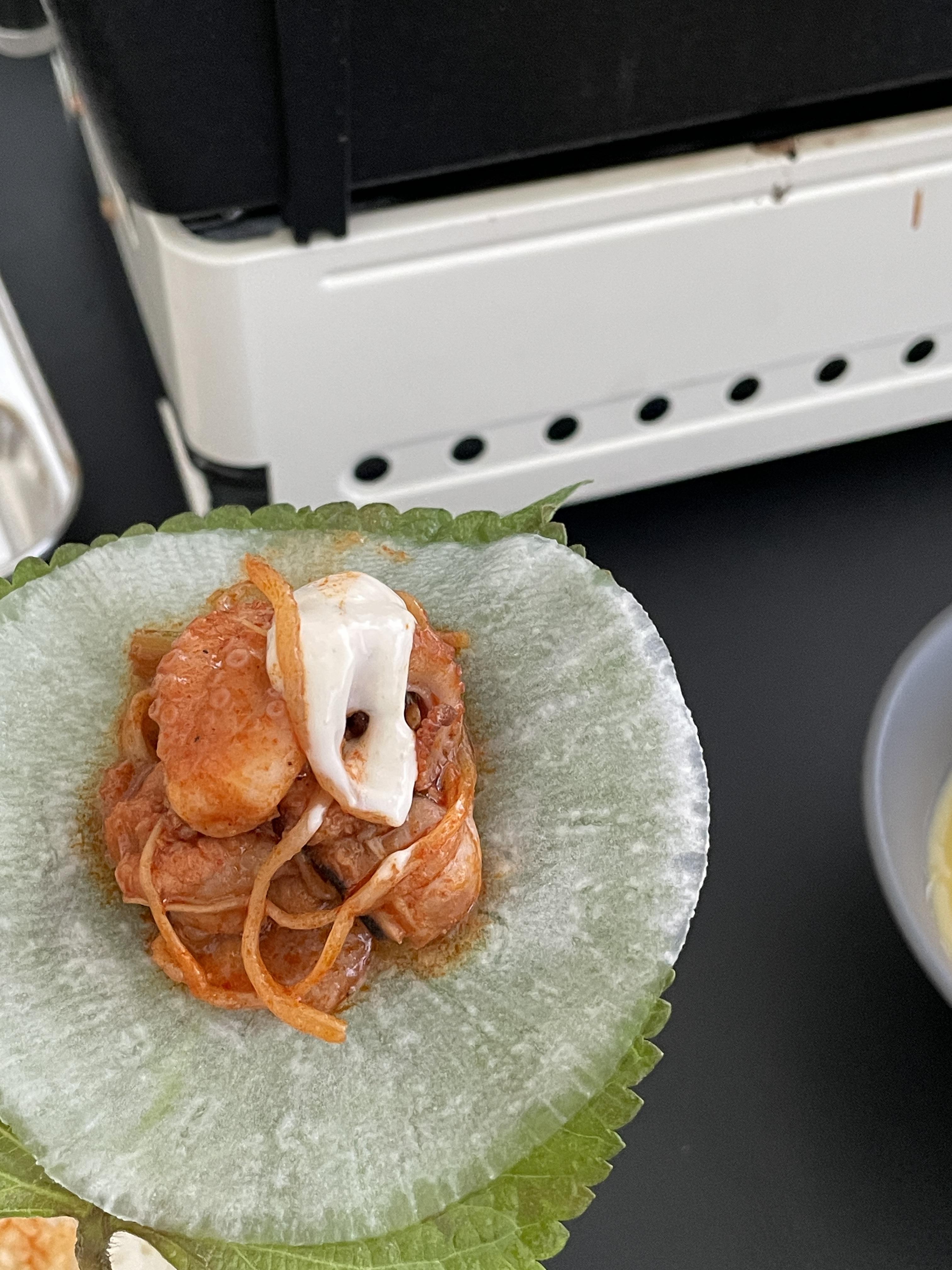 청년사업 레시피 우승 아이템이라고 적혀있던데 좋은 아이디어 같아요 ㅎㅎ 쭈꾸미와 삼겹살의 조화, 게다가 미나리까지 더하니까 모두가 맛있게 먹었어요. 맛있는 조합을 알려드리자면, 깻잎과 쌈무를 저렇게 겹쳐서 드셔보세요.. 맛있는 거+맛있는 거 = 천상의 맛.. ㅋㅋㅋ추천드릴게요!!